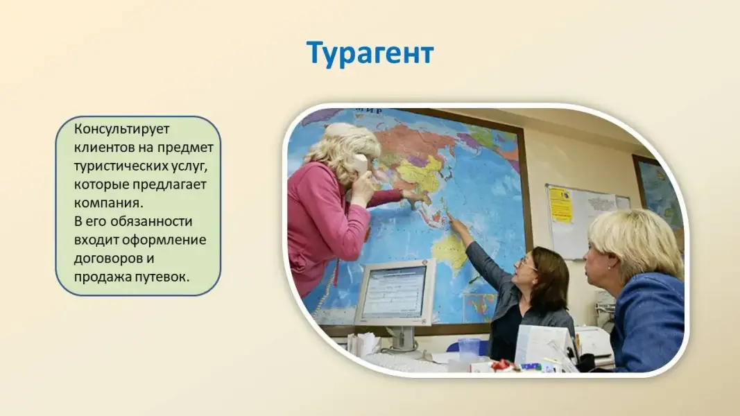 Турагент - консультирует клиентов на предмет туристических услуг, которые предлагает компания. В его обязанности входит оформление договоров и продажа путевок.