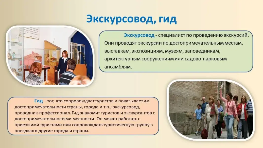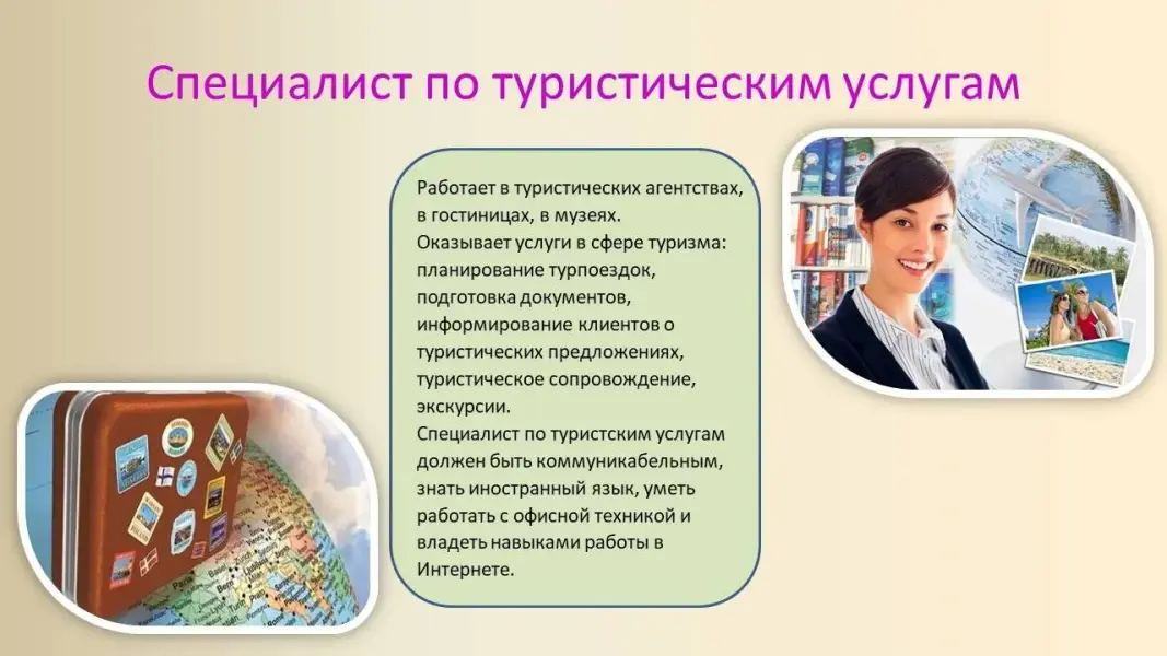 Специалист по туристическим услугам - работает в туристических агентствах, в гостиницах, в музеях. Оказывает услуги в сфере туризма: планирование турпоездок, подготовка документов, информирование клиентов о туристических предложениях, туристическое сопровождение, экскурсии. Специалист по туристским услугам должен быть коммуникабельным, знать иностранный язык, уметь работать с офисной техникой и владеть навыками работы в Интернете.