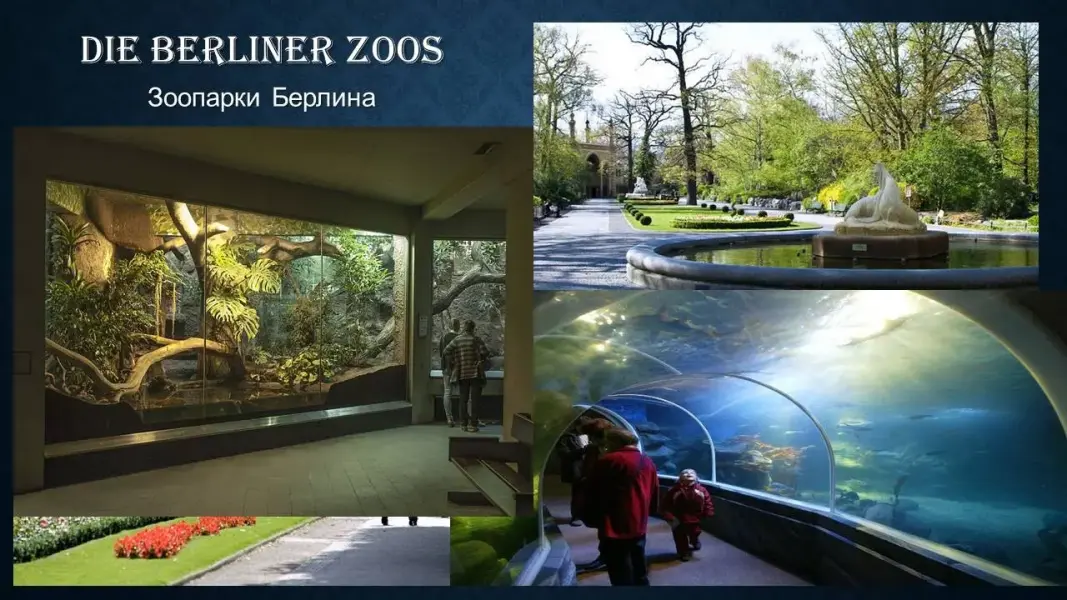 Schüler 5: In Deutschland gibt es viele kleine und große Zoos. Die meisten von ihnen sind schon mehr als 50 Jahre alt. Den Stadt Zoo kann man auch Tierpark oder Tiergarten nennen. In Berlin gibt es den Zoologischen Garten und den Tierpark Berlin-Friedrichsfelde. Der Zoologische Garten wurde 1844 gegründet. Er ist der älteste Zoo Deutschlands. Heute ist er grüne Insel im Westen Berlins. Dort gibt es ein großes Aquarium mit Terrarium. Der Tierpark Friedrichsfelde im Osten Berlins ist der größte Tierpark im Europa. Zum Tierpark gehört auch das Alfred-Brehm-Haus, das größte Raubtierhaus der Welt. In dem Gebäude findet man Tiger, Löwes, Panteren und andere Tiere. Im Tierpark ist immer viel los Kinder und Eltern verbringen hier ihre Freizeit. Besonders lustig sind die Eichhörnchen auf den Bäumen. Auf allen Wiesen leben kleine braune Hasen. In Streichelgehen können die Kinder Ziegen, Schafe und Ponys streicheln. (слайд< 17-18)