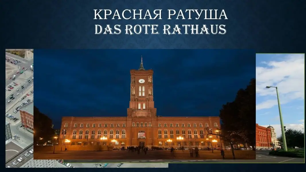 Der Schüler 6: (слайд 19-21) Das Rote Rathaus ist ein Verwaltungsgebäude an der Rathausstraße (bis 1951: Königstraße) im historischen Zentrum Berlins im Ortsteil Mitte. Die Geschichte Berlins ist an den Wänden des Rathauses gezeigt. Die Spitze des Rathauses ist mit acht riesigen Bären dekoriert.