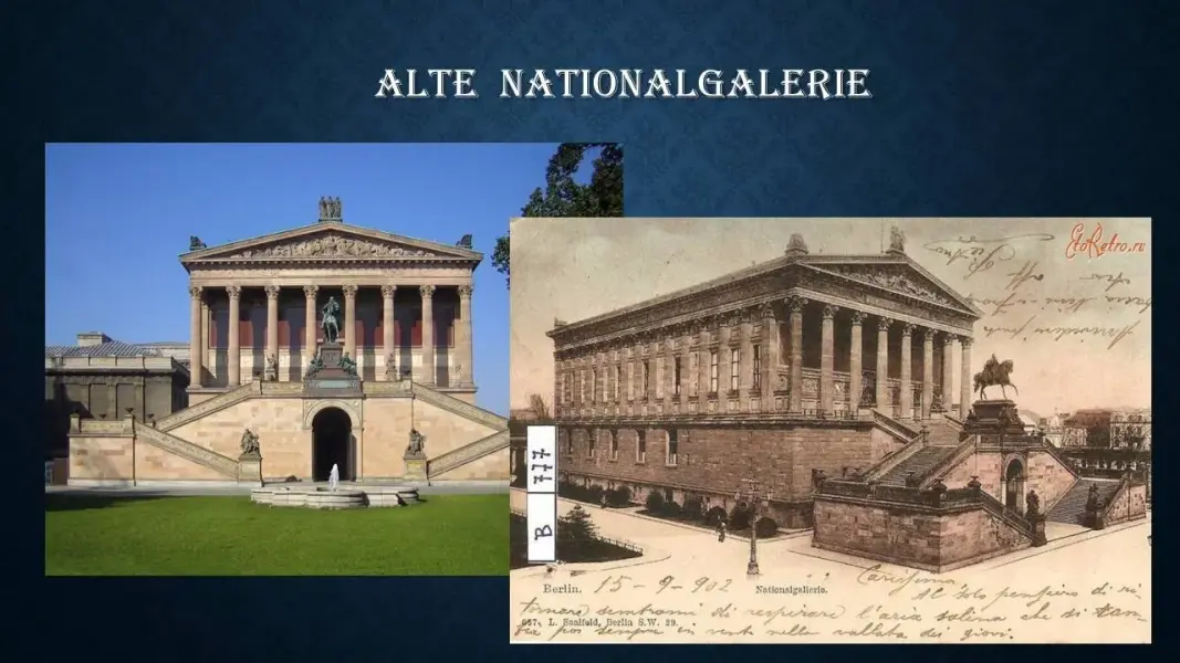 Der Schüler 10 (cлайд 36-40): Die Galerie wurde am 22. März 1876. vom Architekten Friedrich August Shtyuler eröffnet. Das Ziel des Museums war die Sammlung der Werke der preußischen Kunst. In der Sammlung gibt es Gemälde von Künstlern wie Caspar David Friedrich, Karl Friedrich Schinkel, Karl Eduar Ferdinand Blech, Edouard Manet, Claude MONET, Adolph von Menzel, Max Liebermann und Lovis Corinth.