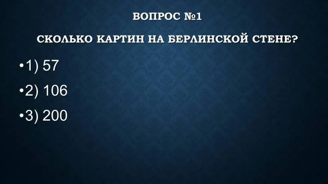Schüler 1: (слайд 1-3) Berliner Mauer ist in der ganzen Welt bekannt. Es gibt 106 Bilder an Berliner Mauer. Heute bleibt sie lebendige Erinnerung an die Kriegstragödie. (Комментирует рассказ на русском языке)
