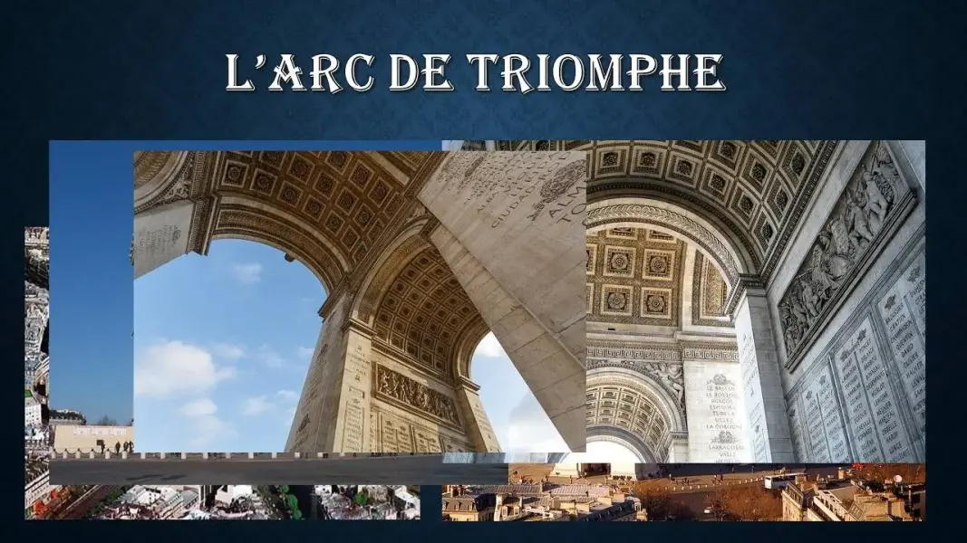 - L'Arc de Triomphe est un monument dans le 8ème arrondissement de Paris à Charles de Gaulle (les Étoiles), érigé par l'architecte Jean Schallgren sur ordre de Napoléon pour commémorer les victoires de sa "Grande Armée". L'arc de triomphe, exécuté dans le style antique. Une belle arche doit être visitée. Au sommet du monument, le visiteur peut profiter d'une vue panoramique sur Paris dans l'après-midi et la nuit.Le musée, хrecréant l'histoire de l'Arc de Triomphe, situé à lintérieur du bâtiment, complète la visite.