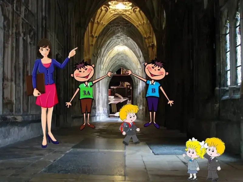 Мимо Маши и Вити прошел в сторону кабинета ученик. Оба человечка приветливо заулыбались и радостно бросились к нему.