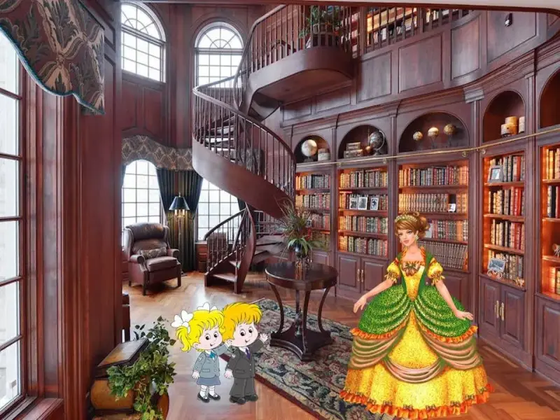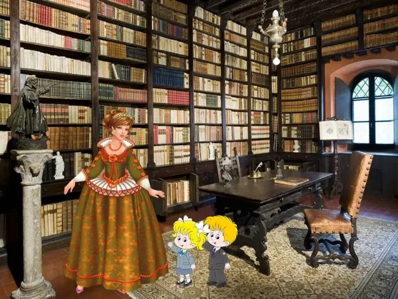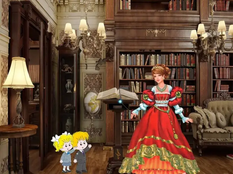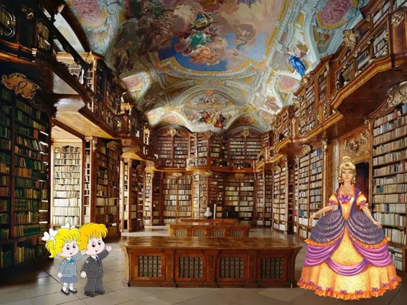 Л. - Маша и Витя подошли к замку. Только они дотронулись до двери, как очутились в библиотеке хозяйки, волшебницы Приставки 1. (слайд 6 - библиотека 1)