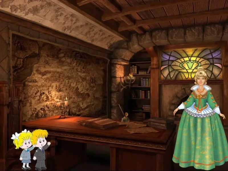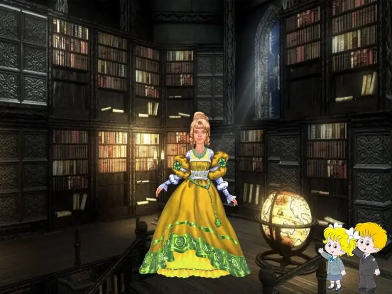 Л. - Через несколько секунд после прибытия к четвёртому замку Маша и Витя попали в библиотеку очередной волшебницы Приставки. (слайд 20 - библиотека 3)