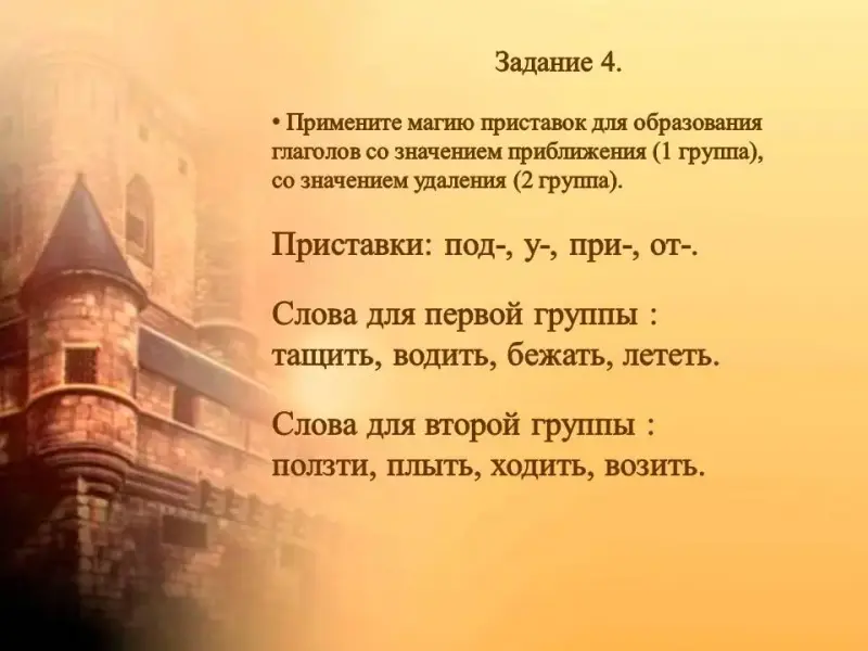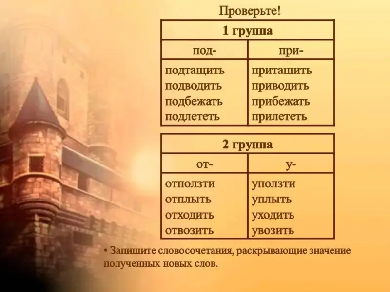 Л. - Примените магию приставок для образования глаголов со значением приближения (первая группа), со значением удаления (вторая группа).