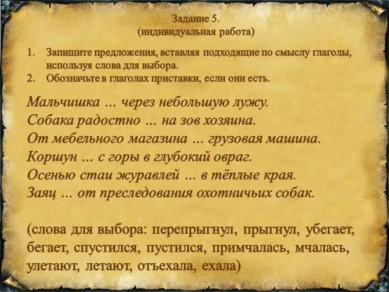 Л. - Запишите предложения, вставляя подходящие по смыслу глаголы, используя слова для выбора. Обозначьте, если есть, приставки в этих словах. (Работа по индивидуальным карточкам. Несколько человек могут работать у доски.)