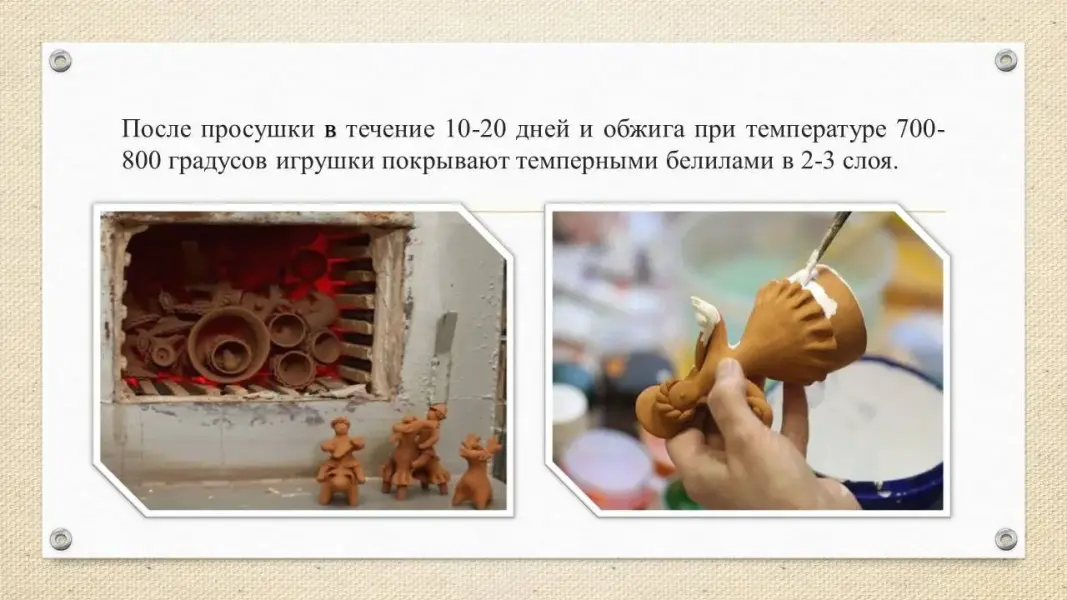 По осени на лугах на всю зиму заготавливали красную глину, а на отмелях-чистый речной песок. Глину и песок смешивали и получили готовый материал для игрушек. Фигурки обычно лепят по частям, используя при этом жидкую глину как связующий материал. После просушки в течение 10-20 дней и обжига при температуре 700-800 градусов игрушки покрывают темперными белилами в 2-3 слоя. Раньше игрушки белили мелом, разведенным в молоке. В старину дымковские игрушки расписывали анилиновыми красителями, замешанными на яйце и квасе, а вместо кистей использовали палочки и перья. Для росписи использовали 6-10 тонов. Уже расписанную игрушку покрывали взбитым яйцом для того чтобы блеклые анилиновые краски заблестели и приобрели яркость. На сегодняшний день для росписи применяют темперные краски и мягкие колонковые кисти. Мастера используют самые различные цвета: красный, синий, желтый, зеленый, алый. Все это придает игрушке особенную яркость и нарядность. (Слайд10, 11,12)