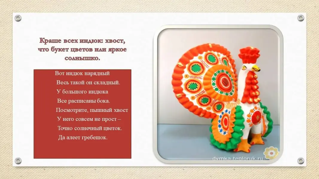 Что же общего у всех этих игрушек? (Белый фон, яркие краски, геометрические узоры, нарядные детали, обобщенная форма). Можно предположить, что белый фон взяли от заснеженных полей. Лепили игрушки зимой, когда все вокруг белым-бело. В тех местах зима длинная и снега много. Сидит мастер у окна, видит вокруг все в снегу, и хочется ему сделать игрушку такой чистой и белой как снег. Но ведь игрушки делались к празднику. Поэтому расписывали их яркими красками, которые особенно хорошо выделяются на белом фоне. В дымковской игрушке радует пышность форм, буйство цвета и жизнерадостная фантазия. (слайд 13)