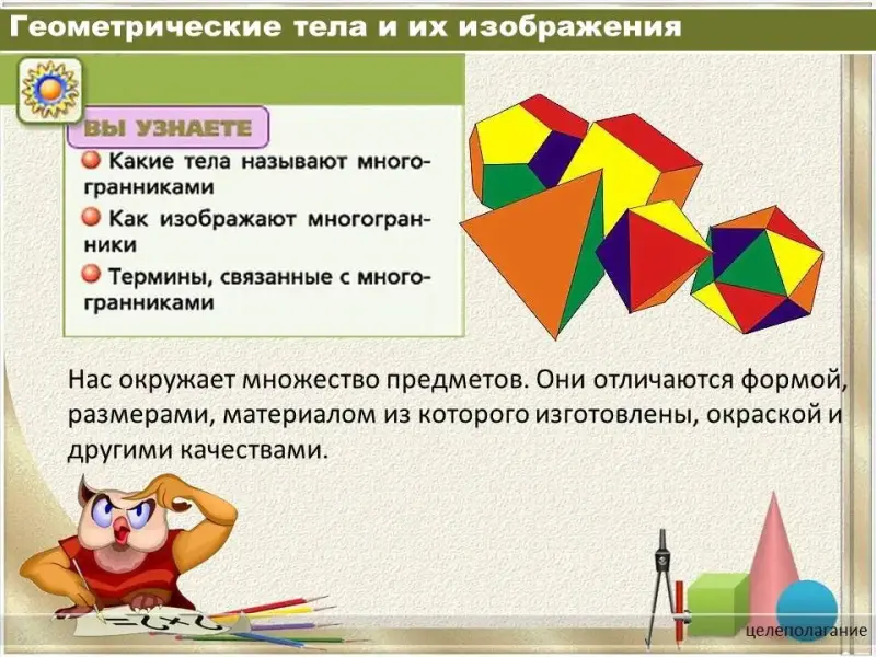 - Предметные: различать многогранники из многообразия геометрических тел; верно использовать в речи термины: геометрическое тело, многогранник, поверхность, грань, ребро,