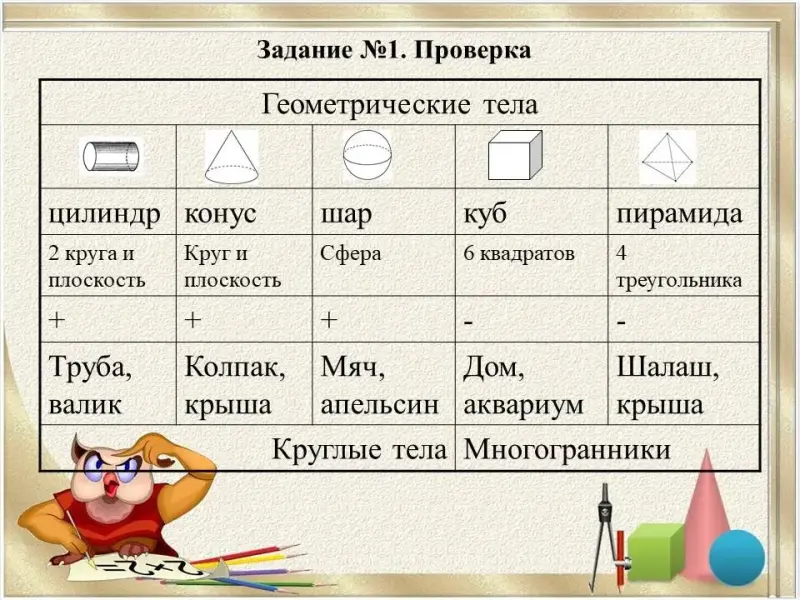 Отметьте знаком «+» фигуры, поверхность которых состоит не только из плоских фигур |