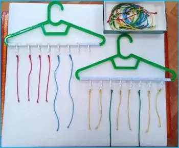 Материал: Яркие атласные шнурочки разной длины, прикреплённые к колечкам, на конце нити - узелок, детские вешалки-плечики с прикреплёнными к каждой пластмассовыми 8 крючками.