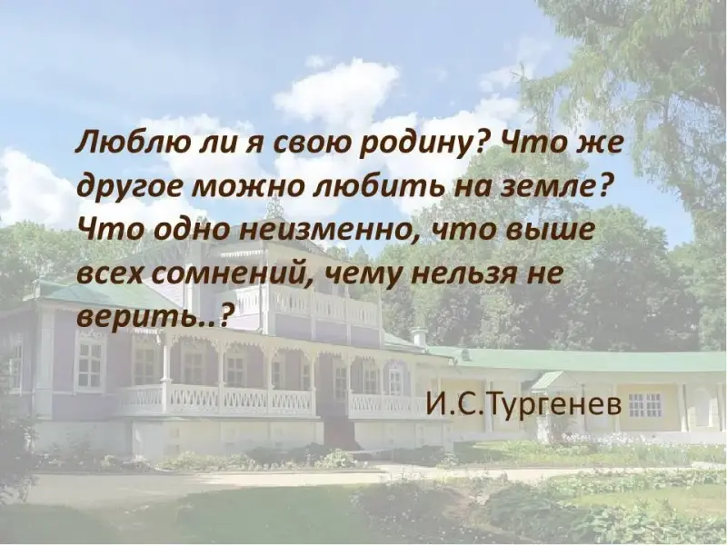 На экране: Люблю ли я свою родину? Что же другое можно любить на земле? Что одно неизменно, что выше всех сомнений, чему нельзя не верить..?)