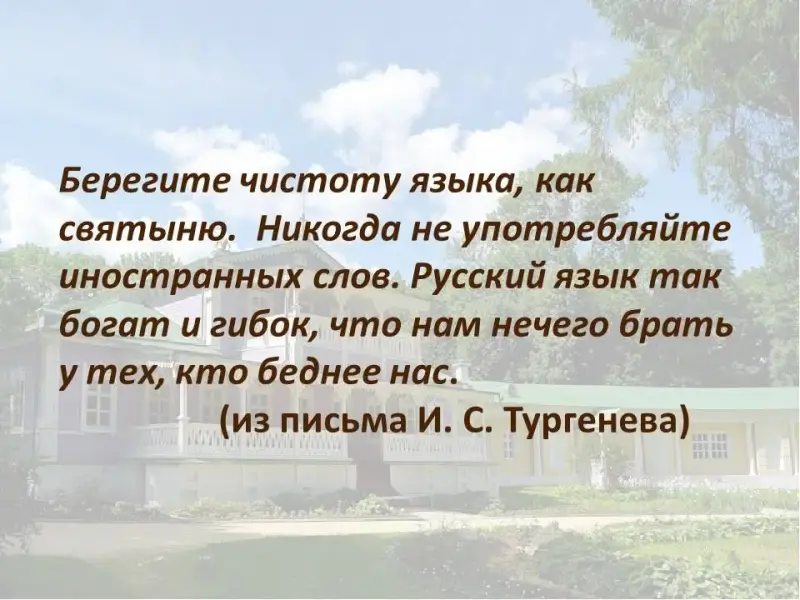 На экране: Берегите чистоту языка, как святыню. Никогда не употребляйте иностранных слов. Русский язык так богат и гибок, что нам нечего брать у тех, кто беднее нас.