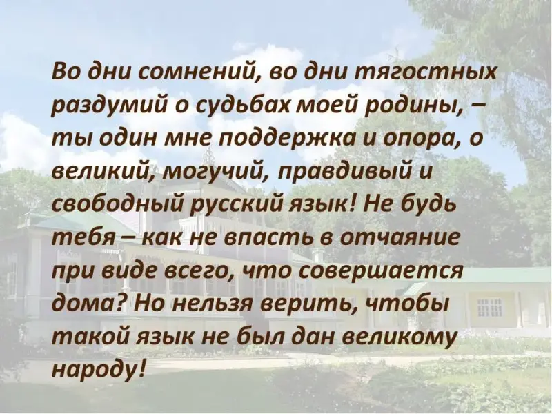 Ученик. Во дни сомнений, во дни тягостных раздумий о судьбах моей родины, - ты один мне поддержка и опора, о великий, могучий, правдивый и свободный русский язык! Не будь тебя - как не впасть в отчаяние при виде всего, что совершается дома? Но нельзя верить, чтобы такой язык не был дан великому народу!