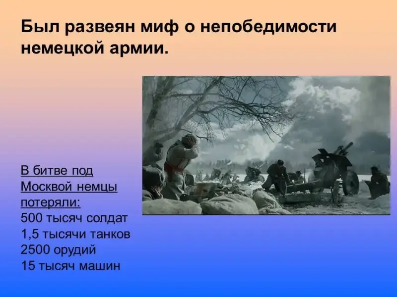 Слайд 17. В битве под Москвой немцы потеряли 500 тысяч солдат, 1,5 тысячи танков, 2500 орудий, 15 тысяч машин. Потери Красной Армии были сопоставимы… В Битве под Москвой русским войнам удалось разгромить большую немецкую группировку войск «Центр» и заставить неприятеля отойти на несколько сот километров от Москвы. Победа под Москвой имела и психологическое значение. Был развеян миф о непобедимости немецкой боевой машины. После победы в Битве под Москвой, Англия, США и еще 26 стран объявили о создании антигерманской коалиции.
