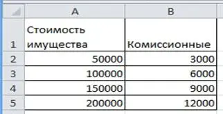 Часто нужно произвести сложением чисел, удовлетворяющих какому-либо условию. В этом случае следует использовать функцию СУММЕСЛИ. Рассмотрим конкретный пример. Имеем таблицу зависимости комиссионных от стоимости имущества ( рис. 2). Нам необходимо подсчитать сумму комиссионных, если стоимость имущества превышает 75000 руб.