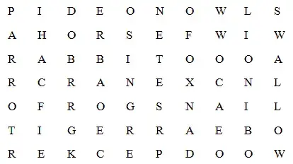 Keymon (monkey), sohre (horse), ogat (goat), phese (sheep), hoghedge (hedgehog), reha (hare), bitrab (rabbit), pionge (pigeon), wol (owl), raprot (parrot), richost (ostrich), wans (swan), rowc (crow), piemag (magpie).