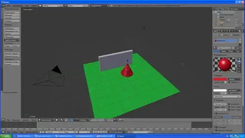 Затем добавим плоскость, раскрасим ее в зеленый цвет, расширим побольше, добавим конус, раскрасим его в красный цвет. Должна получиться следующая сцена.