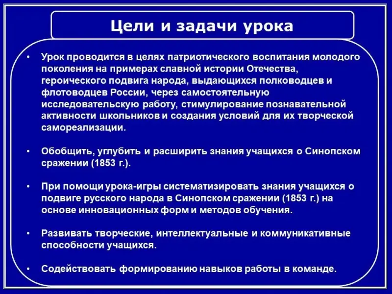 - способствовать повторению и обобщению изученной информации о подвиге русского народа в Синопском сражении (1853 г.);