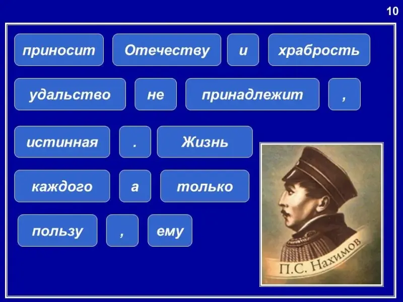 Соберите из рассыпавшихся слов высказывание адмирала П.С.Нахимова. Прочитайте и объясните его смысл.(«Жизнь каждого принадлежит Отечеству, и не удальство, а только истинная храбрость приносит ему пользу». Адмирал П.С.Нахимов).