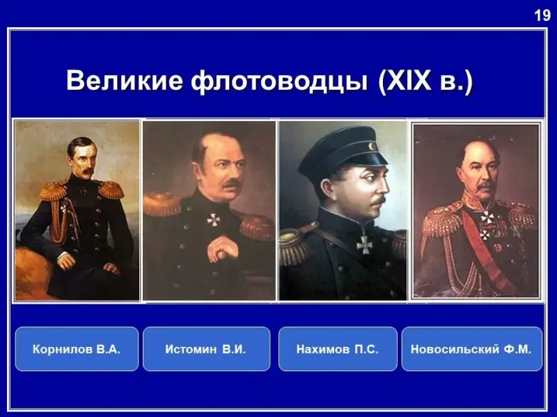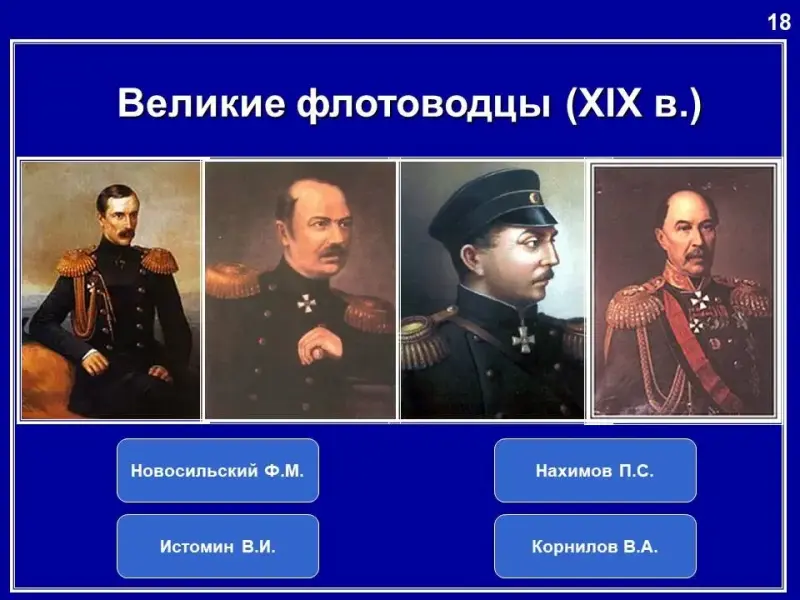На многофункциональной интерактивной панели представлены портреты флотоводцев России. Укажите их имена и расскажите о них.