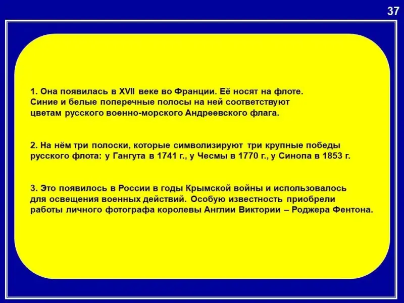 2. На нём три полоски, которые символизируют три крупные победы русского флота: у Гангута в 1741 г., у Чесмы в 1770 г., у Синопа в 1853 г. (Гюйс (форменный воротник)).