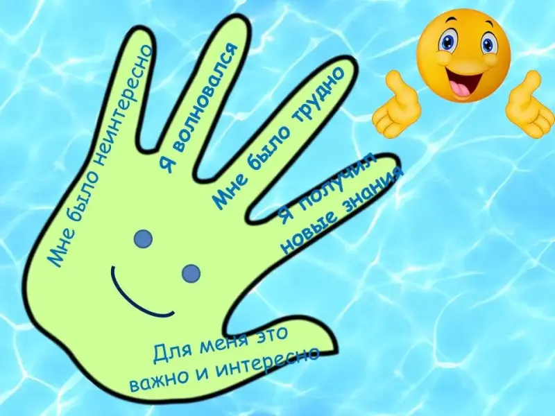 - Теперь обведите на листе бумаги свою руку. Каждый ваш палец - это позиция, по которой надо высказать своё мнение об уроке.