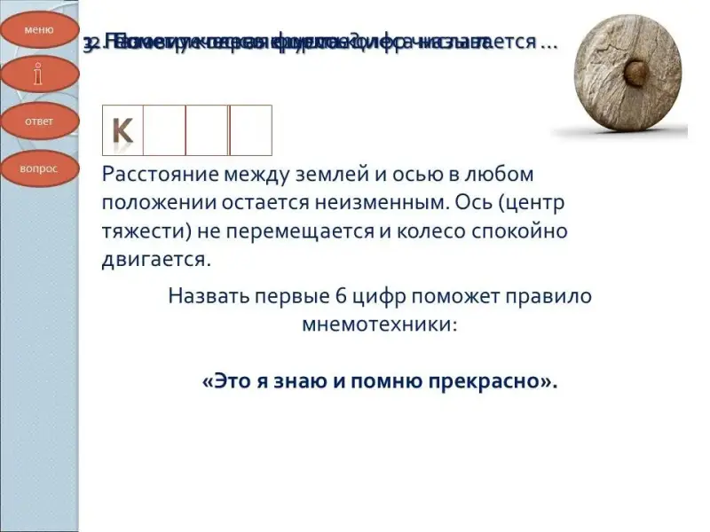 - Назовите первые шесть цифр числа π. (Назвать первые 6 цифр поможет правило мнемотехники: «Это я знаю и помню прекрасно».3, 14168)