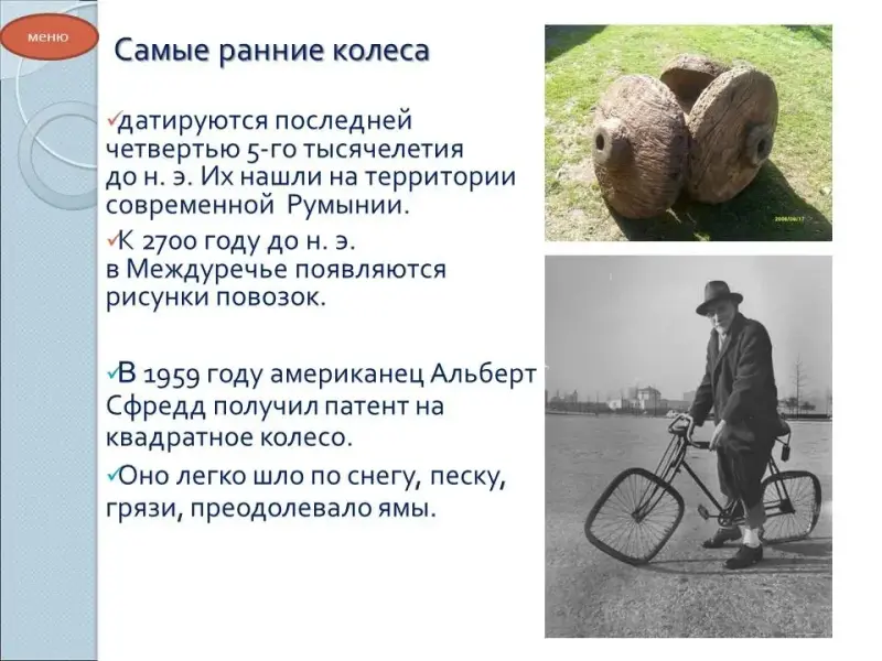 Ведущий 1. А знаете ли вы, что в 1959 году американец А.Сфредд получил патент на квадратное колесо. Оно легко шло по снегу, песку, грязи, преодолевало ямы. Вопреки опасениям, машина на таких колёсах не «хромала» и развивала скорость до 60 км/ч.