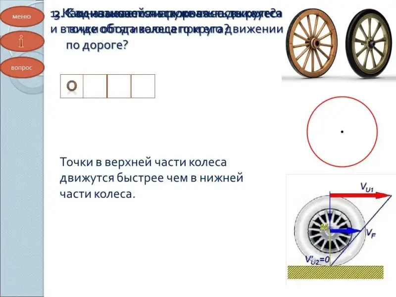 - С одинаковой ли скоростью движутся точки обода колеса при его движении по дороге? (Точки в верхней части колеса движутся быстрее чем в нижней части колеса).