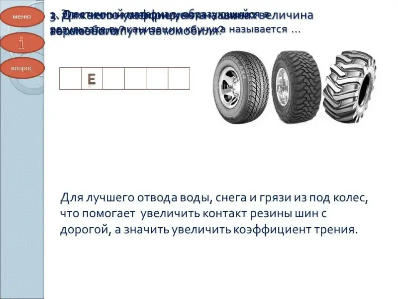 - Для чего нужен рисунок на шинах автомобиля? (Для лучшего отвода воды, снега и грязи из под колес, что помогает увеличить контакт резины шин с дорогой, а значить увеличить коэффициент трения).