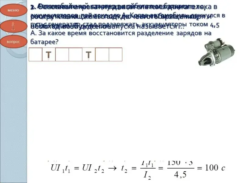 - Автомобильный стартер 3 с работал от батареи аккумуляторов при токе 150 А. Когда автомобиль двинулся в путь, генератор стал подзаряжать аккумуляторы током 4,5 А. За какое время восстановится разделение зарядов на
