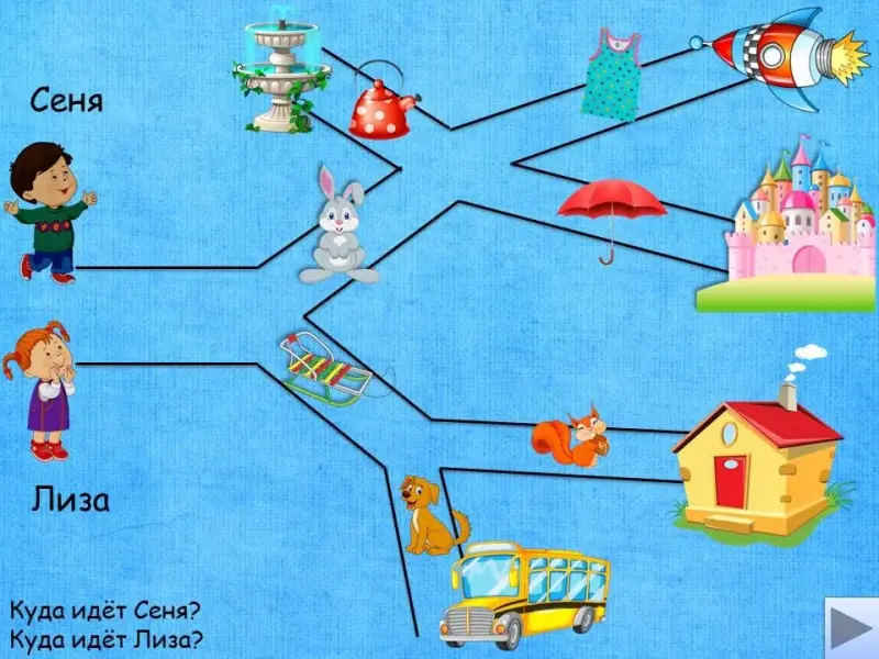 Выполняют игровое упражнение, выбирают дорожки, по которым пойдут Сена и Лиза.
