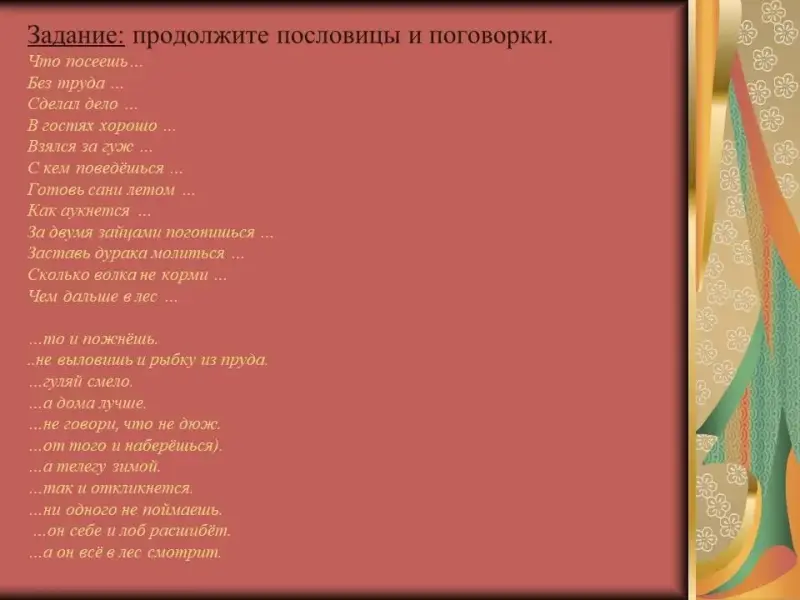 - пополнить активный словарный запас учащихся пословицами и поговорками;