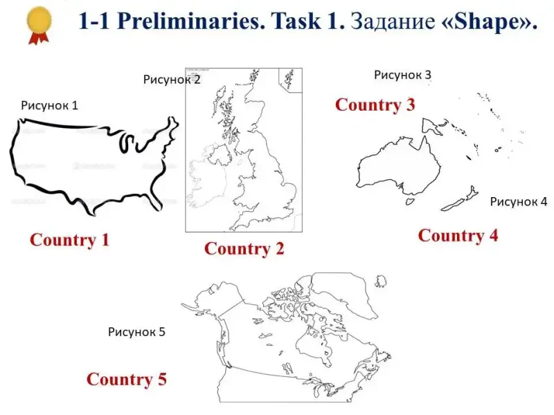 Teacher: Our first competition is «Shape». So, I'll give each team a sheet of paper. You can see the shapes of different English-speaking countries there. Guess what countries have such shapes. You have three minutes for the task. (см. Приложение №1). В течение трех минут учащиеся обсуждают свои ответы и записывают их, изучая рисунки 1-5.