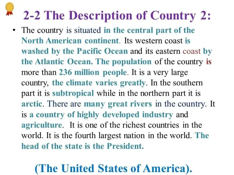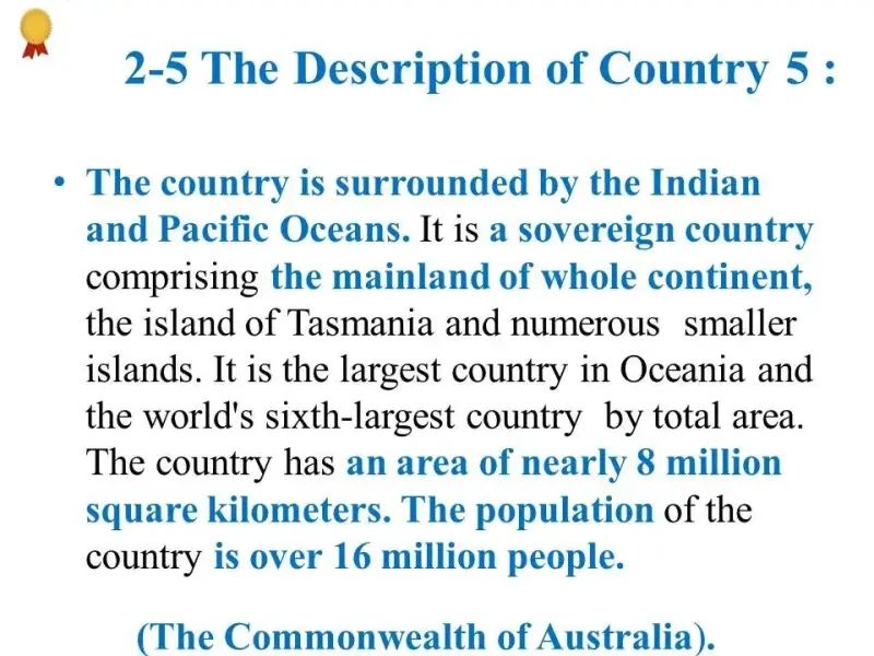 Teacher: The rules of this game are the following. I read you some texts about English-speaking countries but I don't mention the name of the country. You listen to me very
