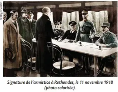 Un armistice met fin à la Grande Guerre. Lundi 11 novembre 1918, 11 heures : dans toute la France, les cloches sonnent à la volée. Au front, les clairons bondissent sur les parapets et sonnent le « Cessez-le-feu », « Levez-vous », « Au drapeau ». La Marseillaise jaillit à pleins poumons des tranchées. Même soulagement en face, dans le camp allemand. Pour la première fois depuis quatre ans, Français et Allemands peuvent se regarder sans s'entretuer. Un armistice (arrêt des combats) a été conclu le matin entre les Alliés et l'Allemagne, dernière des Puissances centrales à rendre les armes. Il laisse derrière lui huit millions de morts et six millions de mutilés. Les survivants ont perdu la foi dans les valeurs morales et spirituelles qui ont fait la grandeur et l'unité de l'Europe. Mais ils veulent croire que cette guerre qui s'achève restera la dernière de l'histoire, la « der des ders ». L'armistice est conclu pour 36 jours mais sera régulièrement renouvelé jusqu'au traité de Versailles du 28 juin 1919.