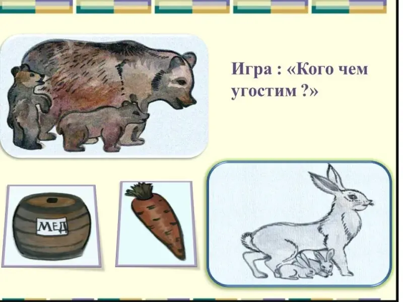 Ответы детей: (Морковь мы дадим зайчихе с зайчатами, мёд - медведице с медвежатами.)