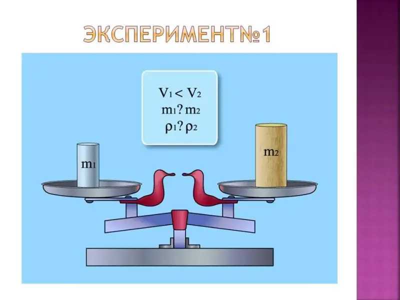 Внимание учеников акцентируется на том, что вещества, в силу разного строения, в разных объемах имеют одинаковую массу, (т.к. весы находятся в равновесии, значит массы равны). Что можно сказать о плотности этих тел?