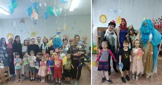 Помещение украшено гелиевыми шарами, к ним на ниточках прикреплены рыбки, морские коньки, морские звезды. Мольберт с изображением подводного мира, гигантского осьминога. Большая ракушка. Костюмы русалочки Ариэль, злой ведьмы Урсулы, Нептуна, медуз.