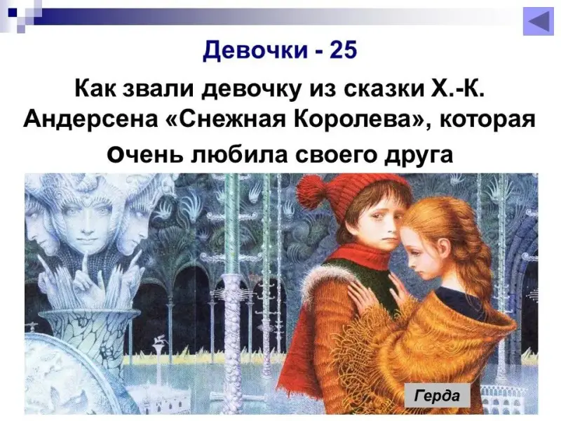 25 баллов. Как звали девочку из сказки Х.-К.Андерсена «Снежная Королева», которая очень любила своего друга? Герда