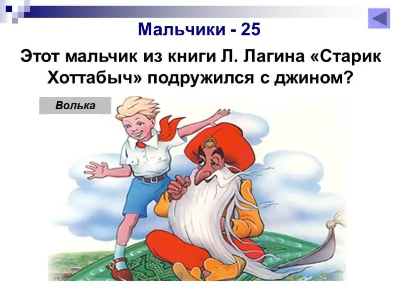 25 баллов. Этот мальчик из книги Л.Лагина «Старик Хоттабыч» подружился с джином? Волька