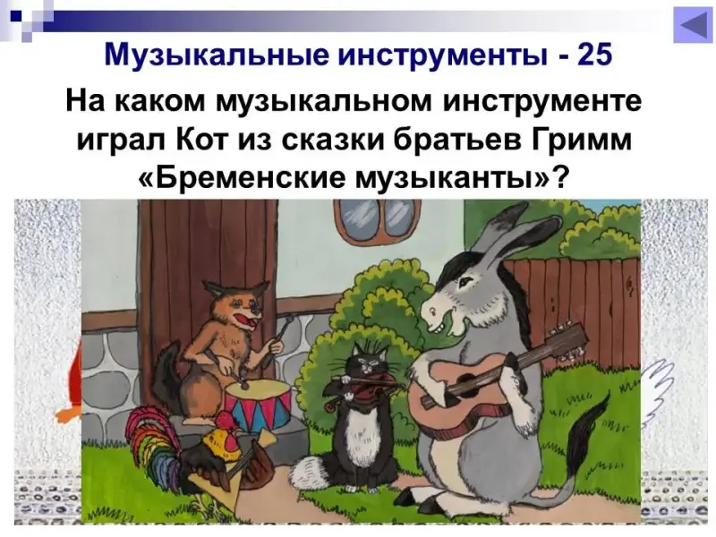 15 баллов. На каком музыкальном инструменте играл Осёл из сказки братьев Гримм «Бременские музыканты»? Гитара