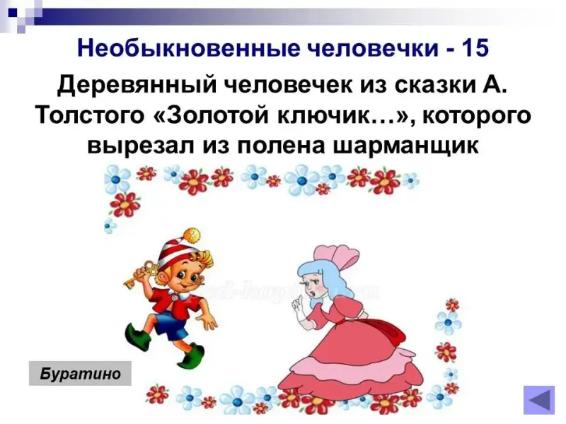 15 баллов. Деревянный человечек из сказки А.Толстого «Золотой ключик…», которого вырезал из полена шарманщик? Буратино