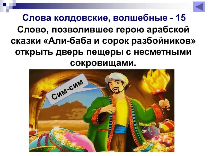 15 балов. Слово, позволившее герою арабской сказки «Али-баба и сорок разбойников» открыть дверь пещеры с несметными сокровищами. Сим-сим