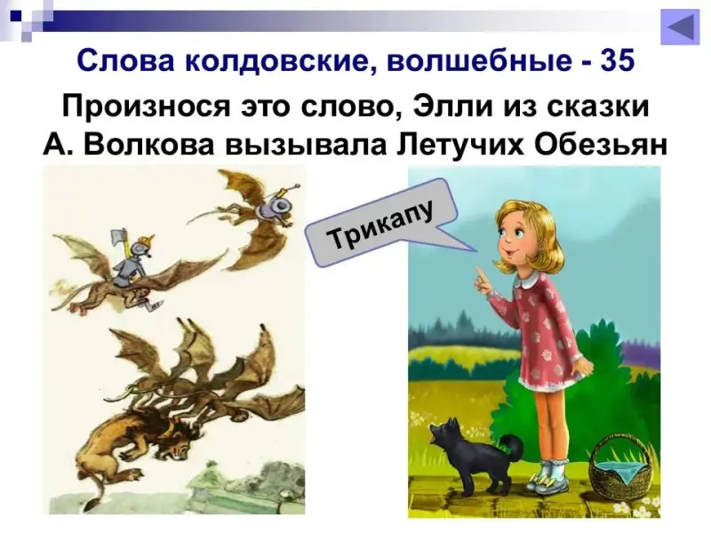 35 баллов. Произнося это слово, Элли из сказки А.Волкова вызывала Летучих Обезьян. Трикапу