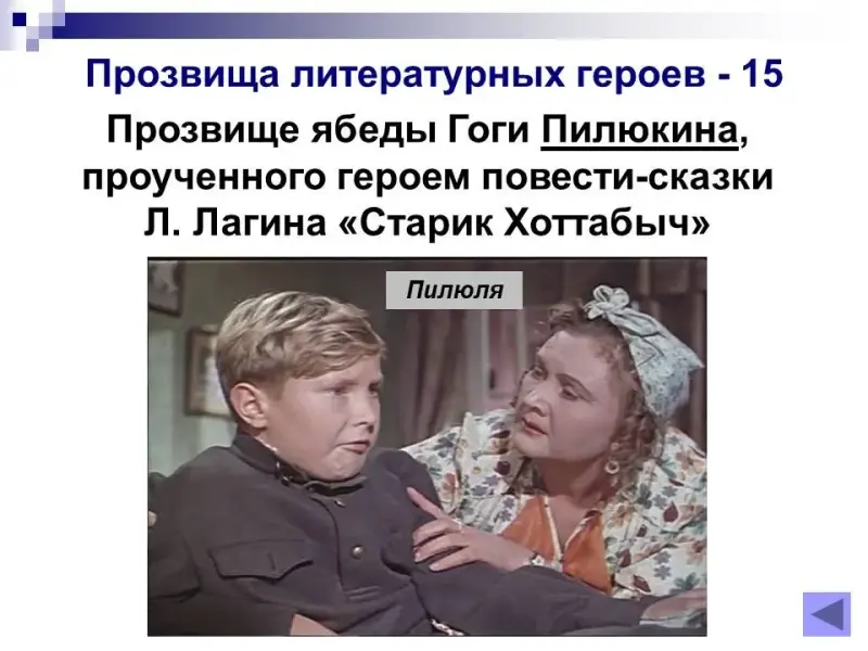 15 балов. Прозвище ябеды Гоги Пилюкина, проученного героем повести-сказки Л.Лагина «Старик Хоттабыч». Пилюля