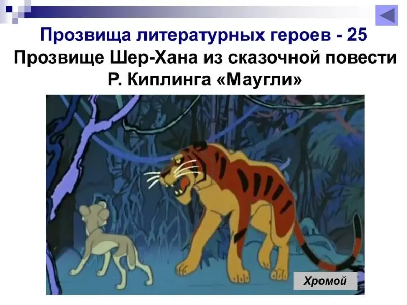 25 баллов. Прозвище Шер-Хана из сказочной повести Р. Киплинга «Маугли». Хромой